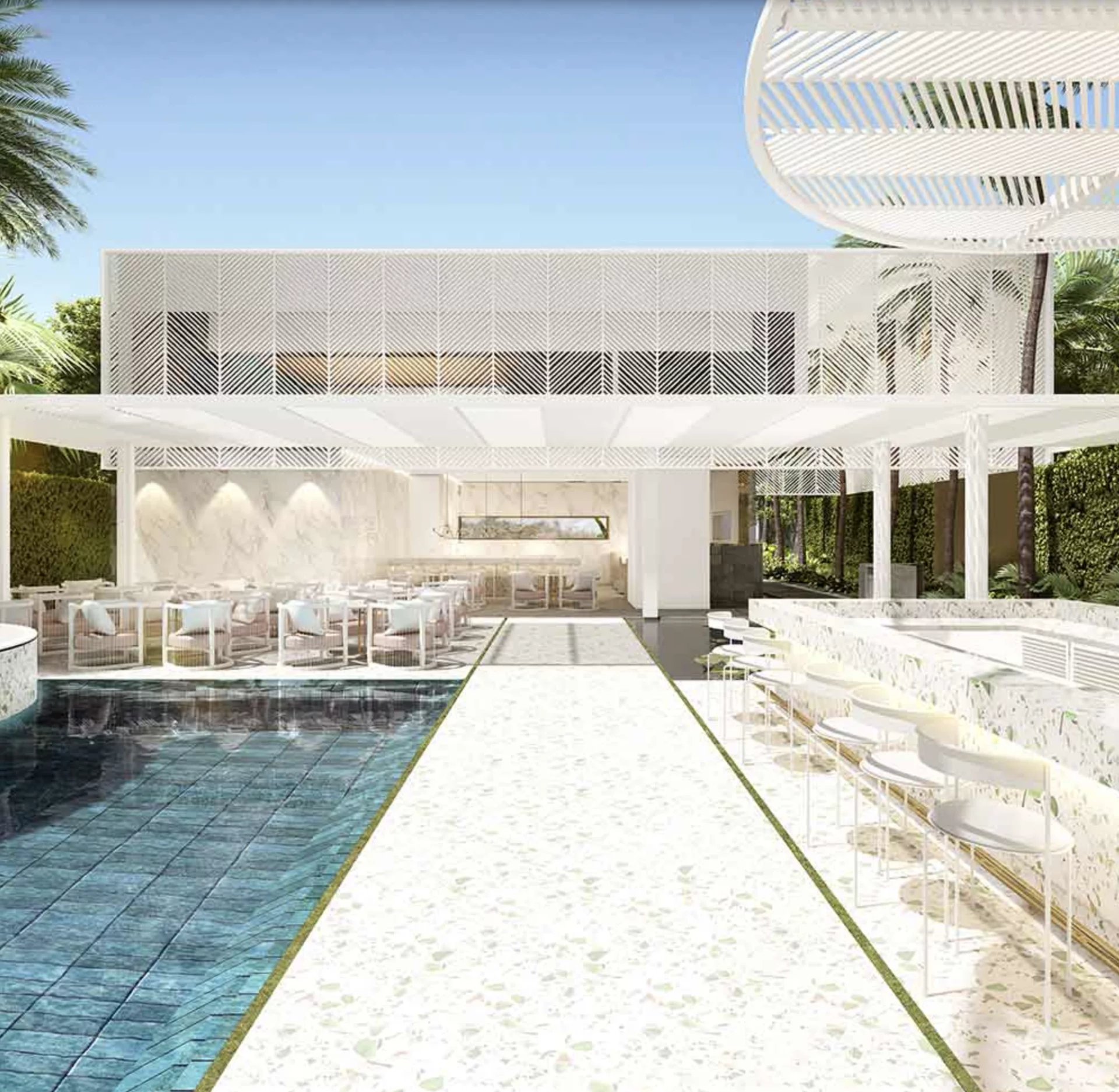 Le promoteur s'est inspiré de l'environnement tropical pour donner au beach club un design unique et original. Il combine l'essence d'un yacht club classique et l'architecture coloniale de l'île Maurice pour créer une atmosphère élégante et moderne.
