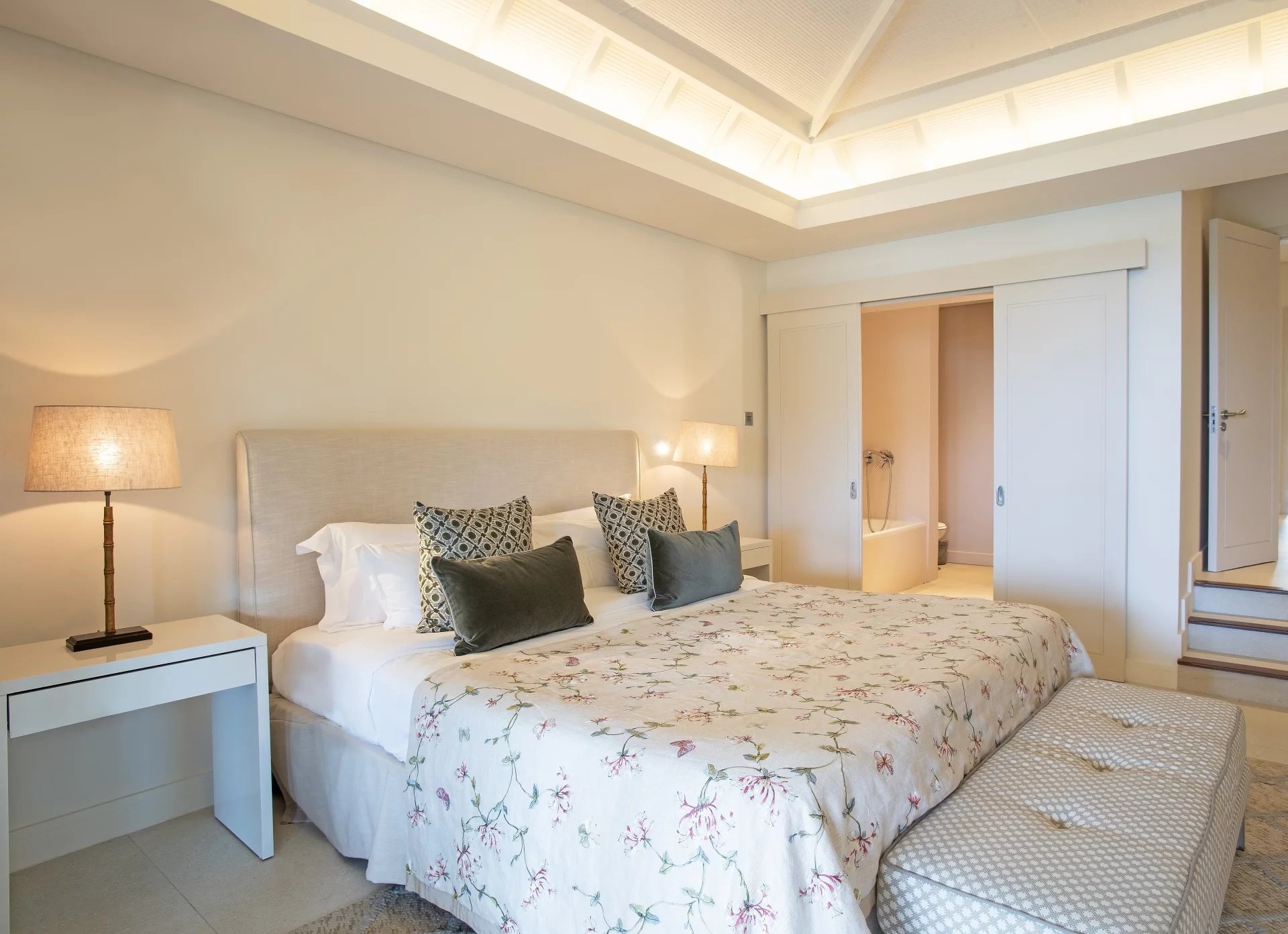 Deux chambres doubles luxueuses avec un grand espace de rangement et des salles de bains contemporaines. La suite parentale offre une vue magnifique sur la mer qui peut également être appréciée depuis la véranda, accessible par une porte coulissante directement depuis la chambre. Cette porte du sol au plafond encourage la lumière naturelle dans la pièce et facilite la vie à l'intérieur et à l'extérieur.