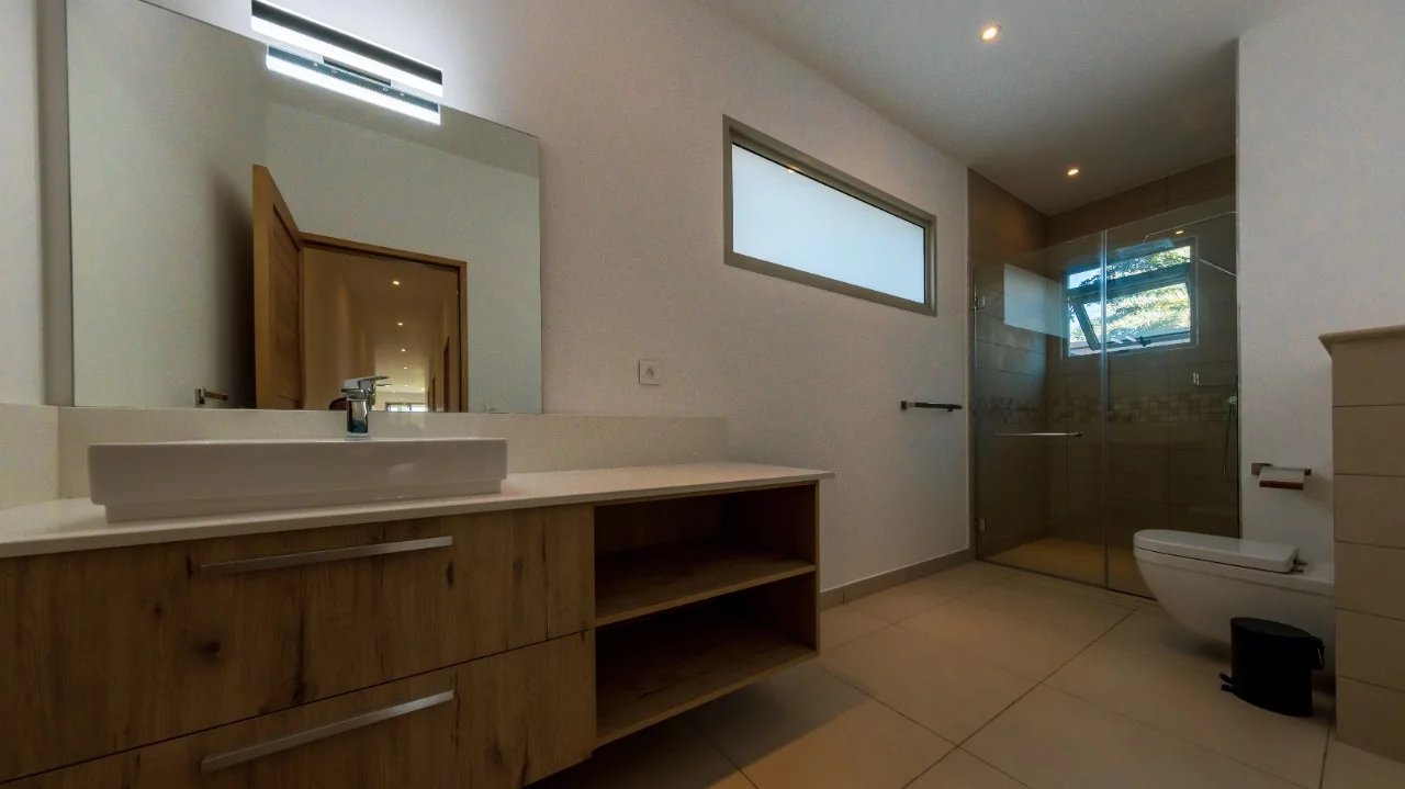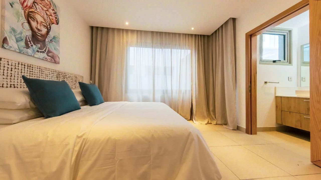 Côté équipement, chaque chambre bénéficie d’une climatisation. Pour la sécurité des résidents, tous les appartements sont équipés d’une vidéosurveillance, une alarme, un ascenseur et un générateur. Le salon et la salle à manger ouvrent directement sur la terrasse par de grandes baies vitrées en aluminium. La cuisine est entièrement équipée pour offrir un confort de vie élevé. De même, chaque appartement comprend une chambre de maître avec dressing et salle de bain privative (douche italienne, double vasque, miroir et WC). Les deux autres chambres double disposent également d’une salle de douche et d’un WC.
