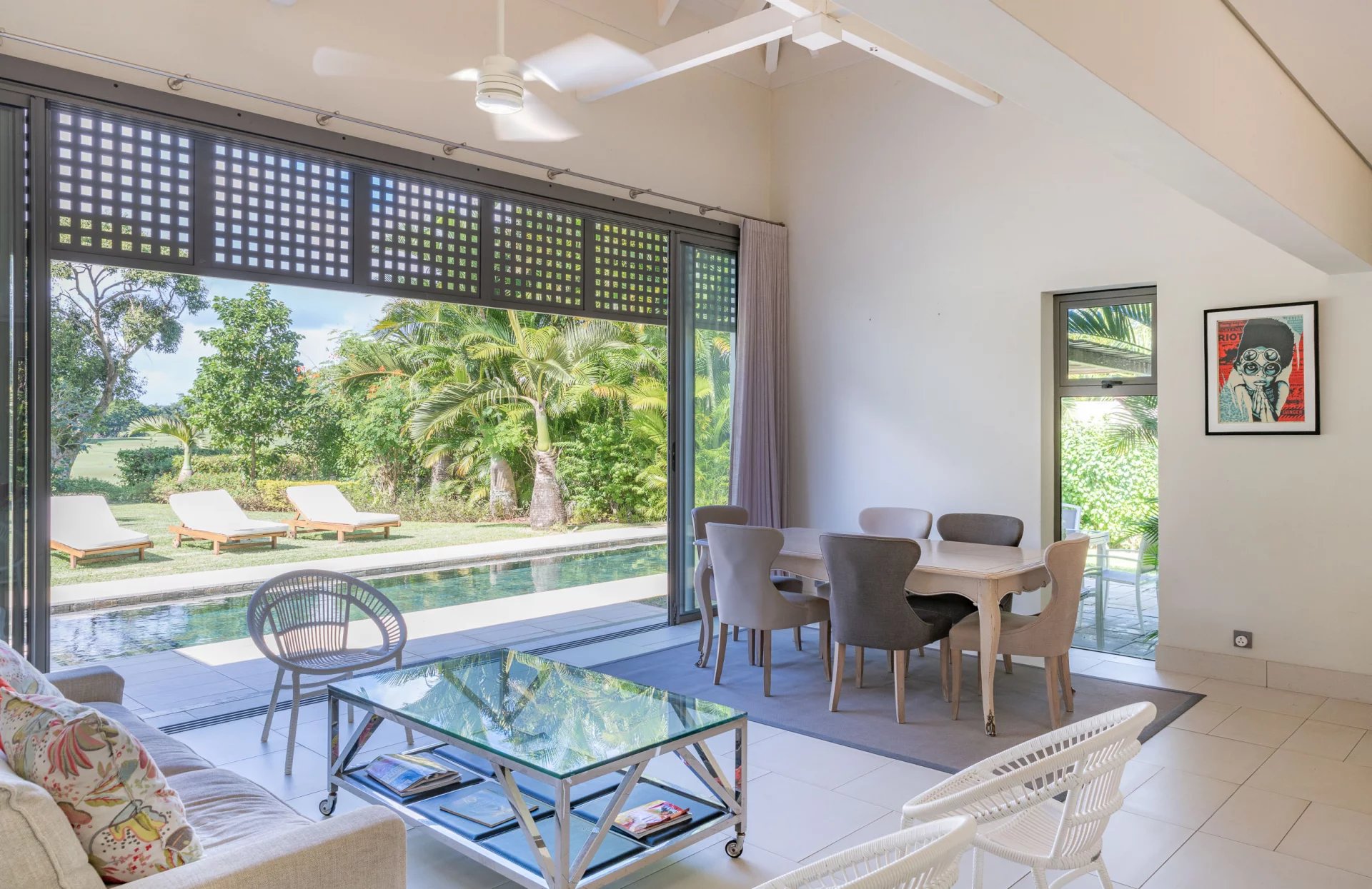 Vaste varangue offrant une vue panoramique sur la piscine, parfaite pour se détendre et profiter de l'extérieur
