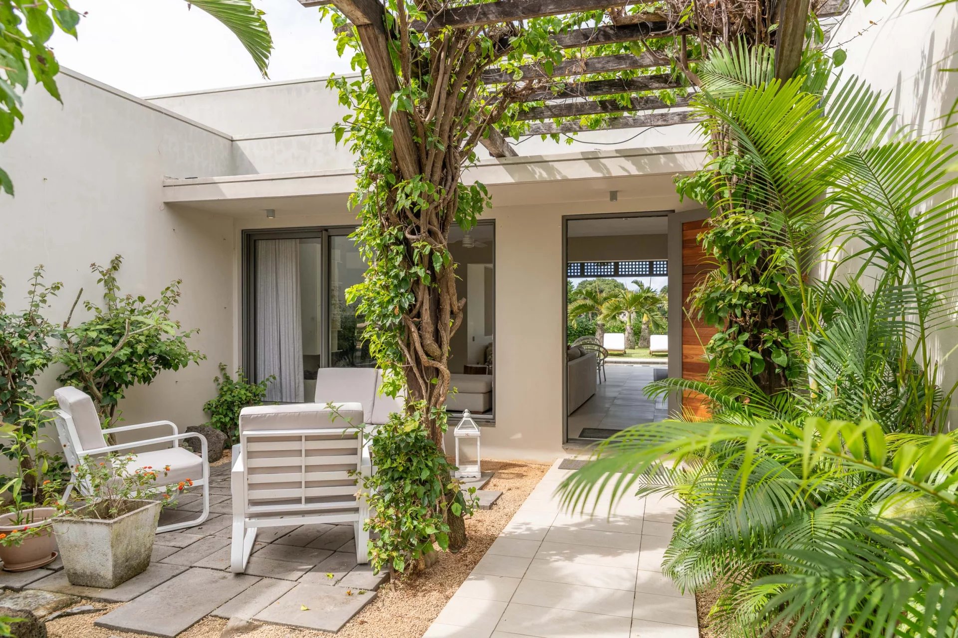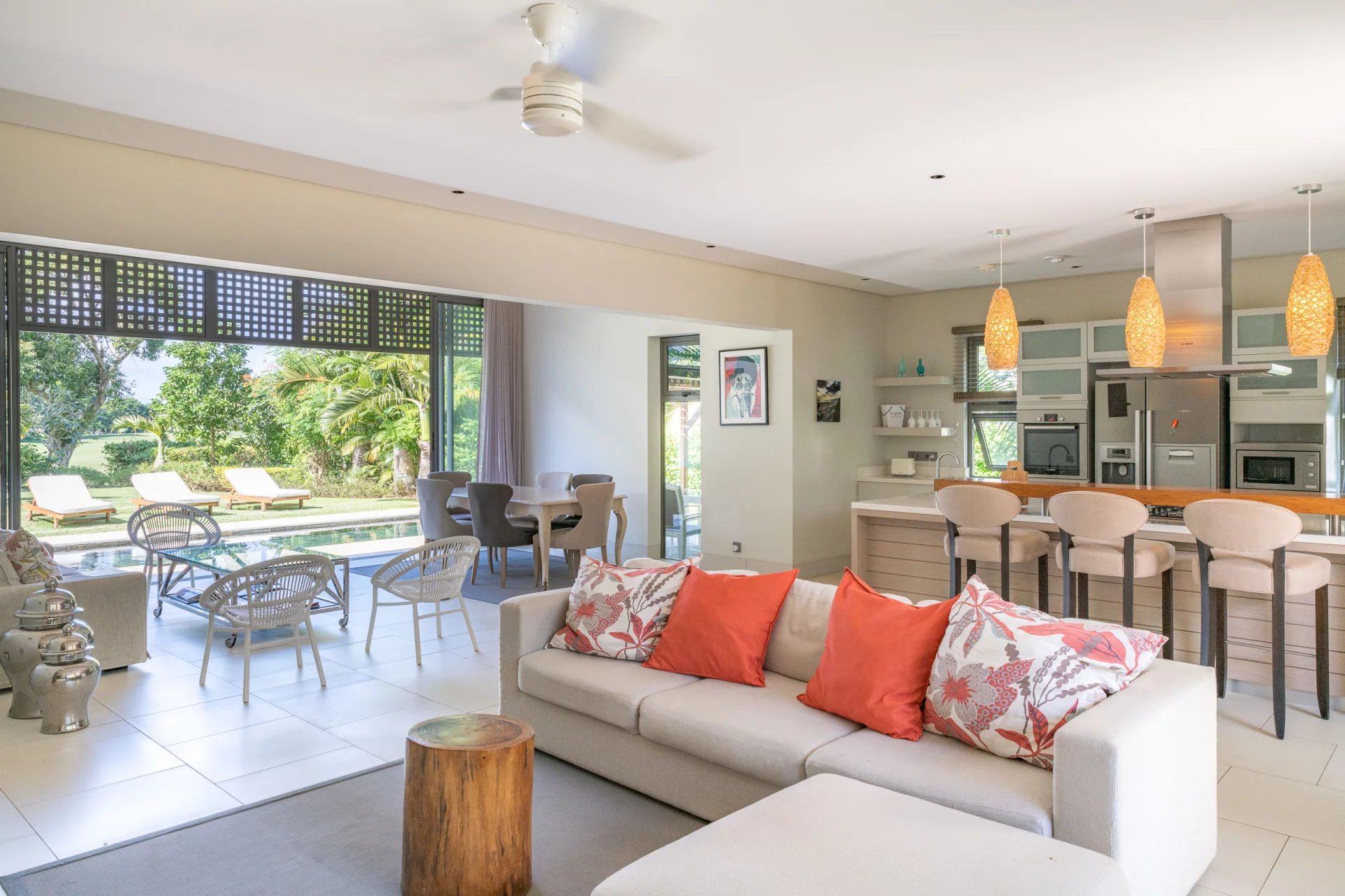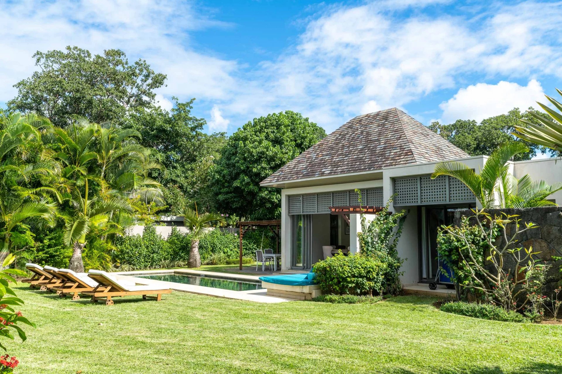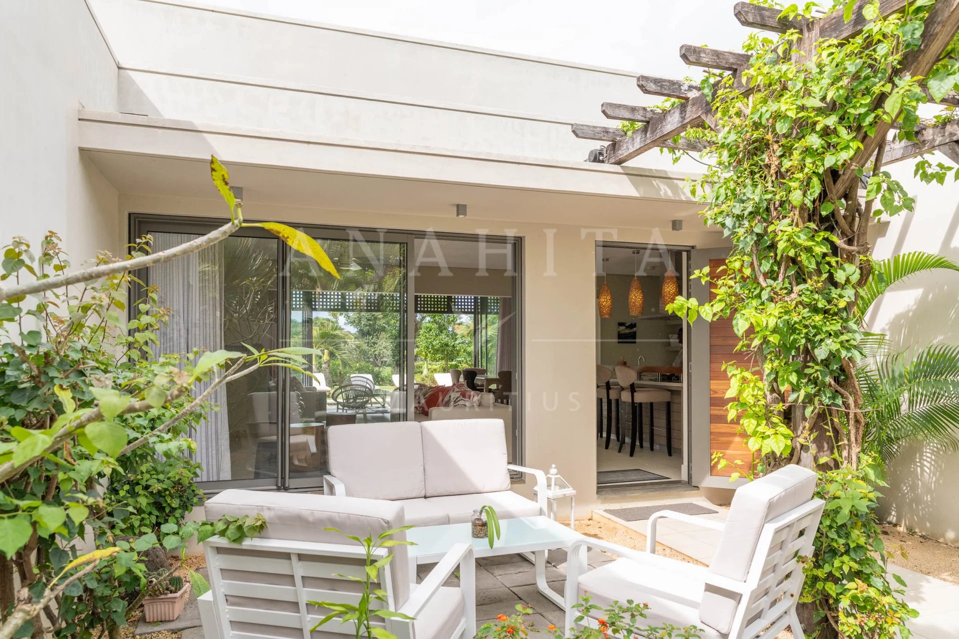 Splendide villa de plain-pied, offrant 3 chambres avec salles de bains attenantes, située dans un cadre idyllique à Anahita Beau Champ.