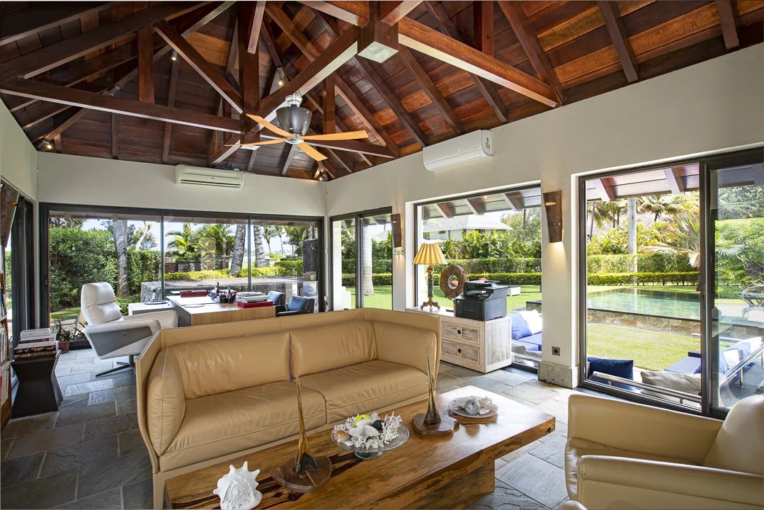 Cette sublime villa de 460 m2 est une véritable invitation à la sérénité. L’un des plus beaux atouts de ce bien est sans conteste son jardin qui possède plus de 50 arbres endémiques, dont des « palmiers royaux », et une échappée visuelle sur le superbe lagon et les fairways du golf de renommée internationale d’Anahita.