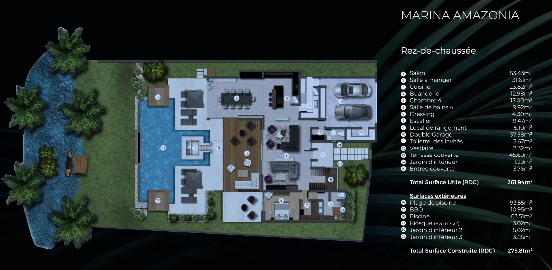 D'une superficie de 503m², cette villa est composée de 4 chambres et salles de bains : Une principale de 30 m2, et trois autres d’environ 17 m2. Un concept avec des intérieurs menant à une grande terrasse, un double garage, une piscine et une entrée ombragée. Les résidents ont un accès direct au canal traversant la résidence. Exclusives à tous les niveaux, les villas ont été conçues pour offrir intimité, confort et espace.Exclusives à tous les niveaux, les villas ont été conçues pour offrir intimité, confort et espace.
