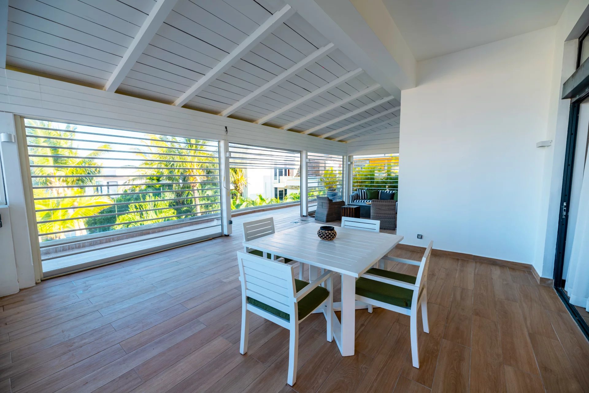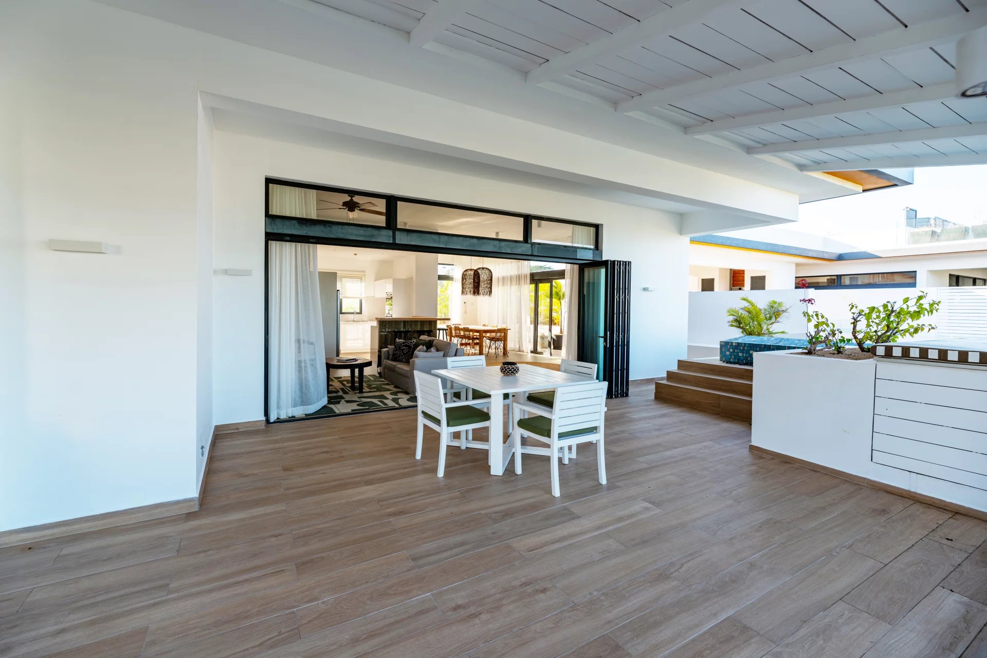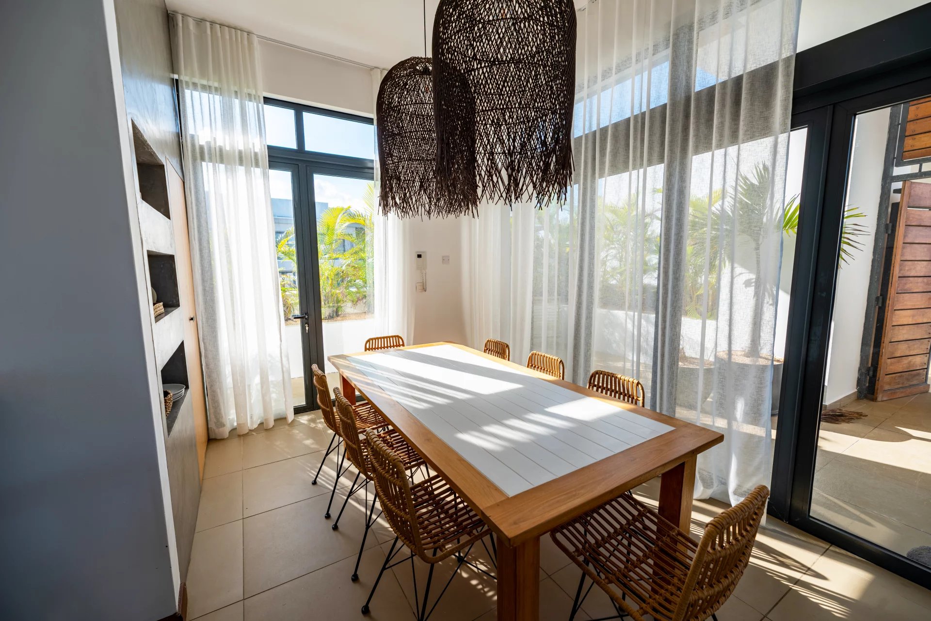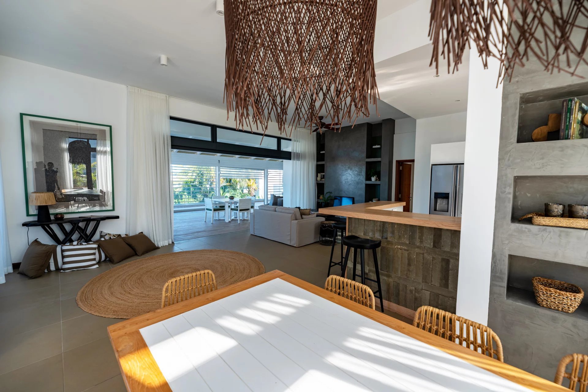 Admirez la beauté de l’environnement tropical avec le son des oiseaux en arrière-plan. De larges ouvertures laissent entrer une lumière apaisante dans la spacieuse pièce de vie qui offre un double volume de toiture au séjour. Une cuisine ouverte entièrement aménagée et équipée complète cet espace de vie convivial.