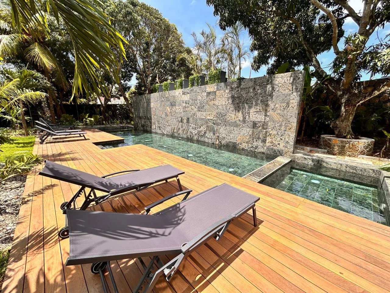 Le concept architectural introduit de somptueuses pièces d'eau tranquilles, un revêtement mural en pierre et un luxueux pont en bois pour une ambiance tropicale apaisante dans toute la propriété.