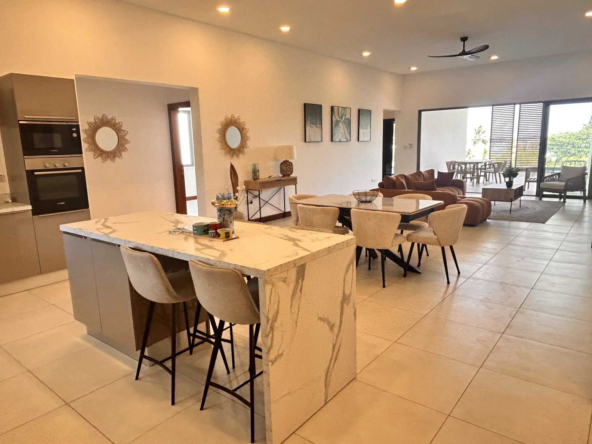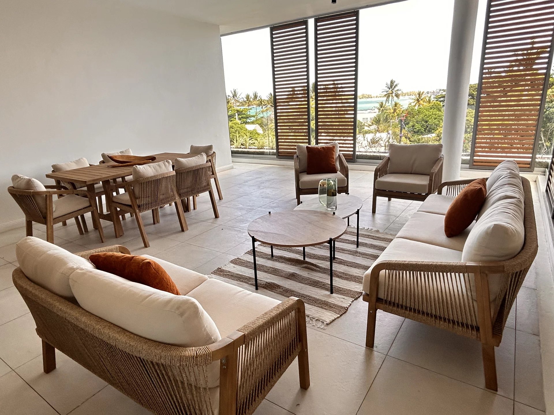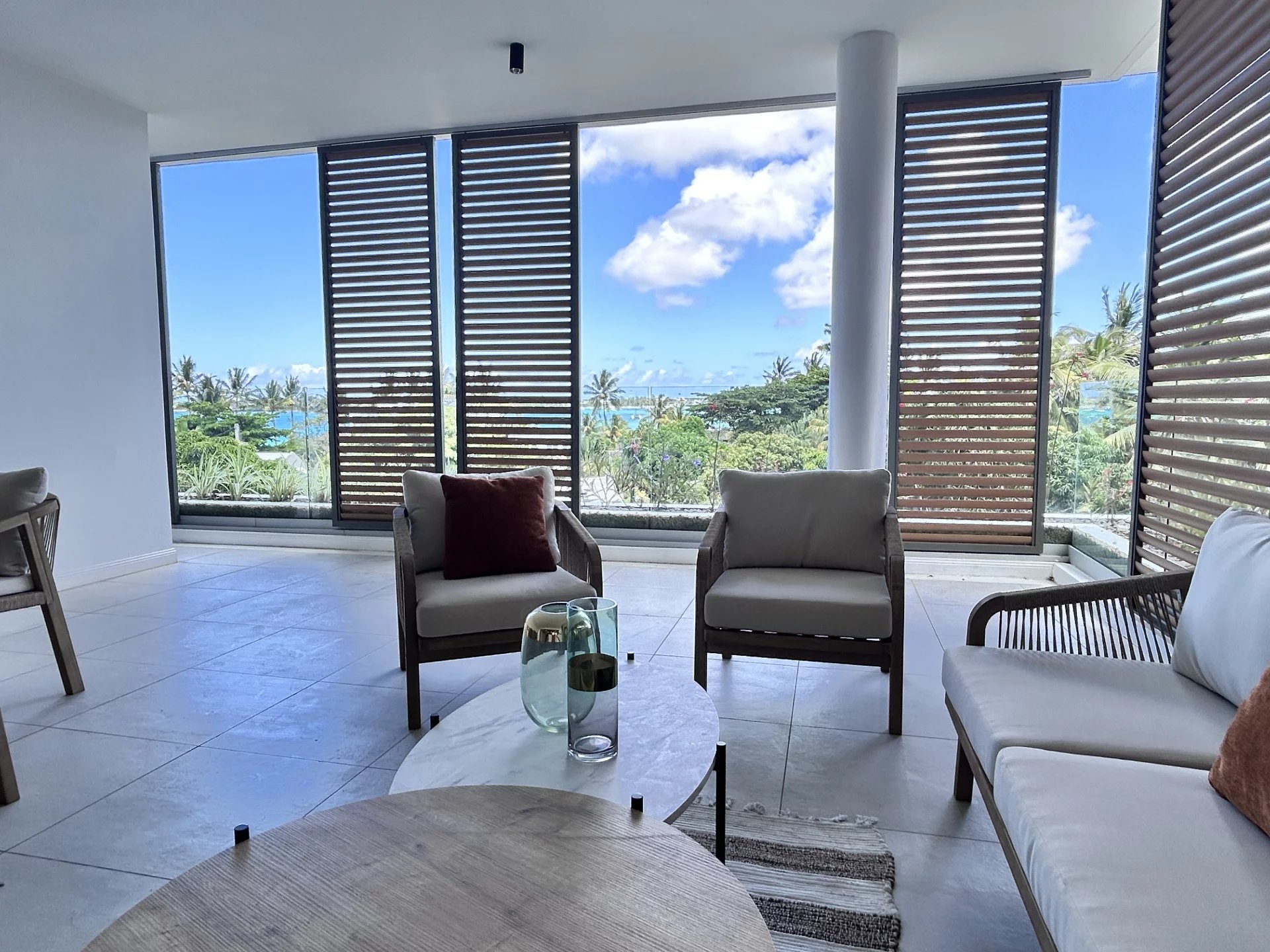 Cet appartement de 246.6m2 avec 3 chambres offre une vue imprenable sur la mer à 180 degrés, du Coin de Mire à la baie de Grand Baie.