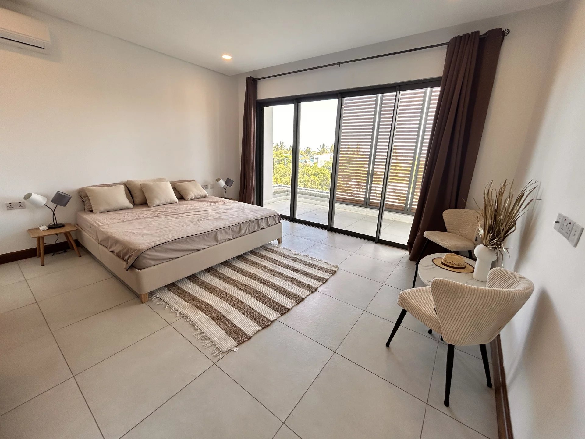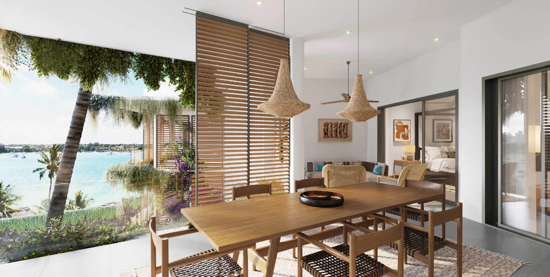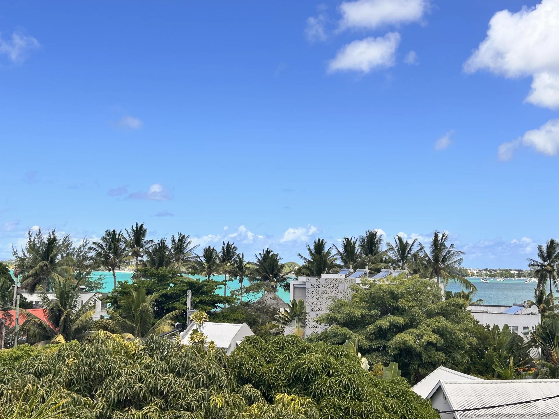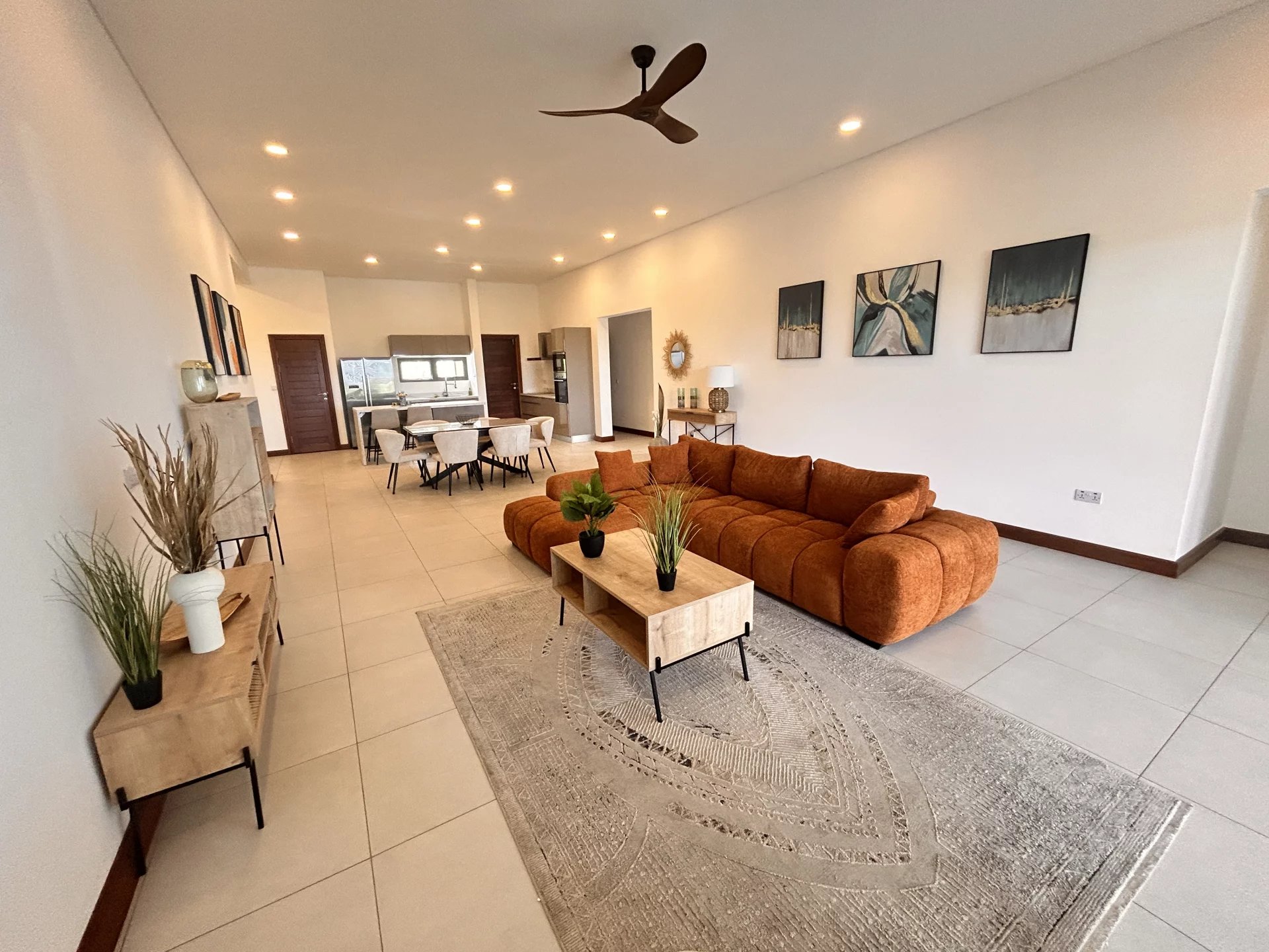 Cet appartement de 246.6m2 avec 3 chambres offre une vue imprenable sur la mer à 180 degrés, du Coin de Mire à la baie de Grand Baie.