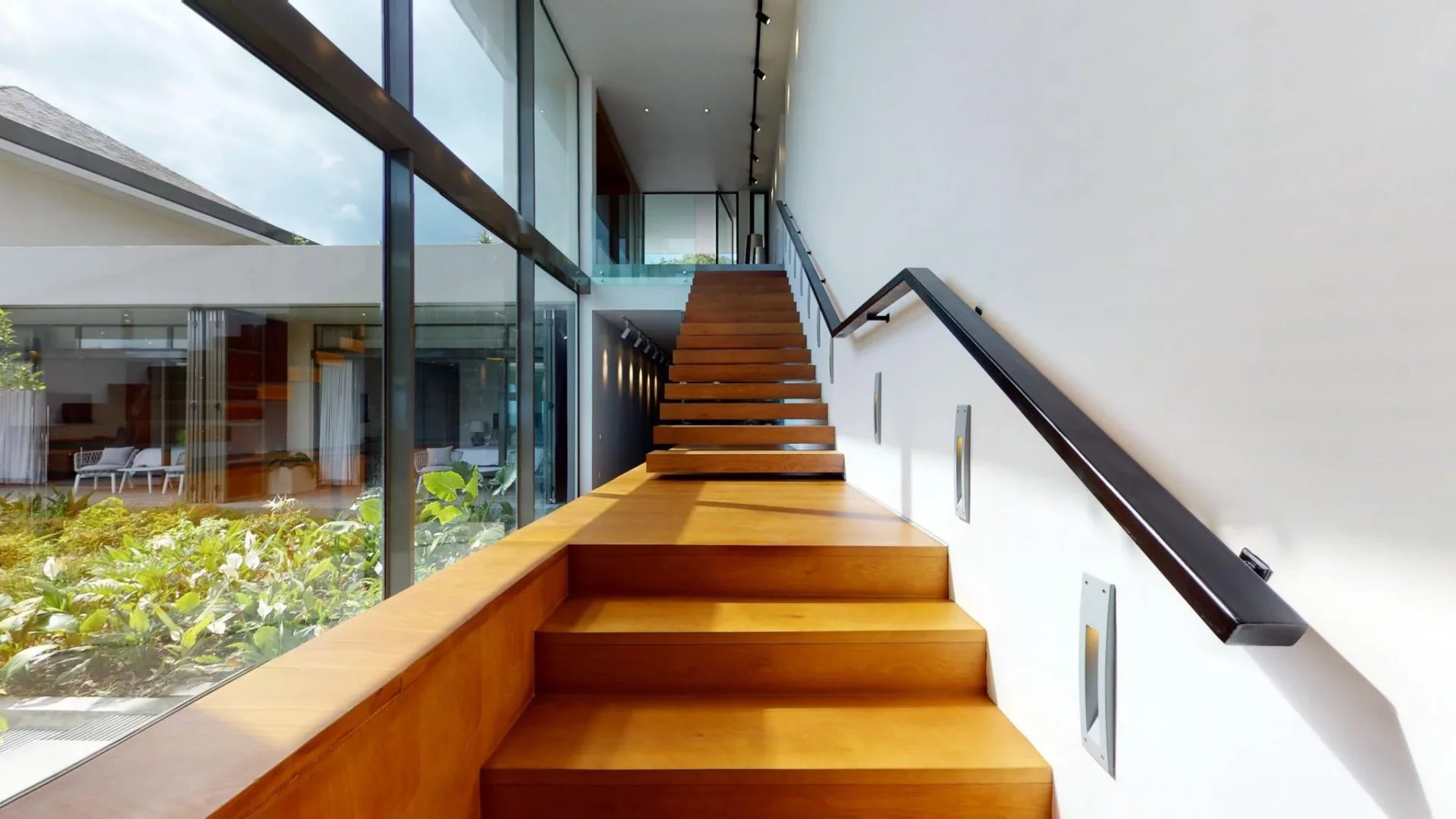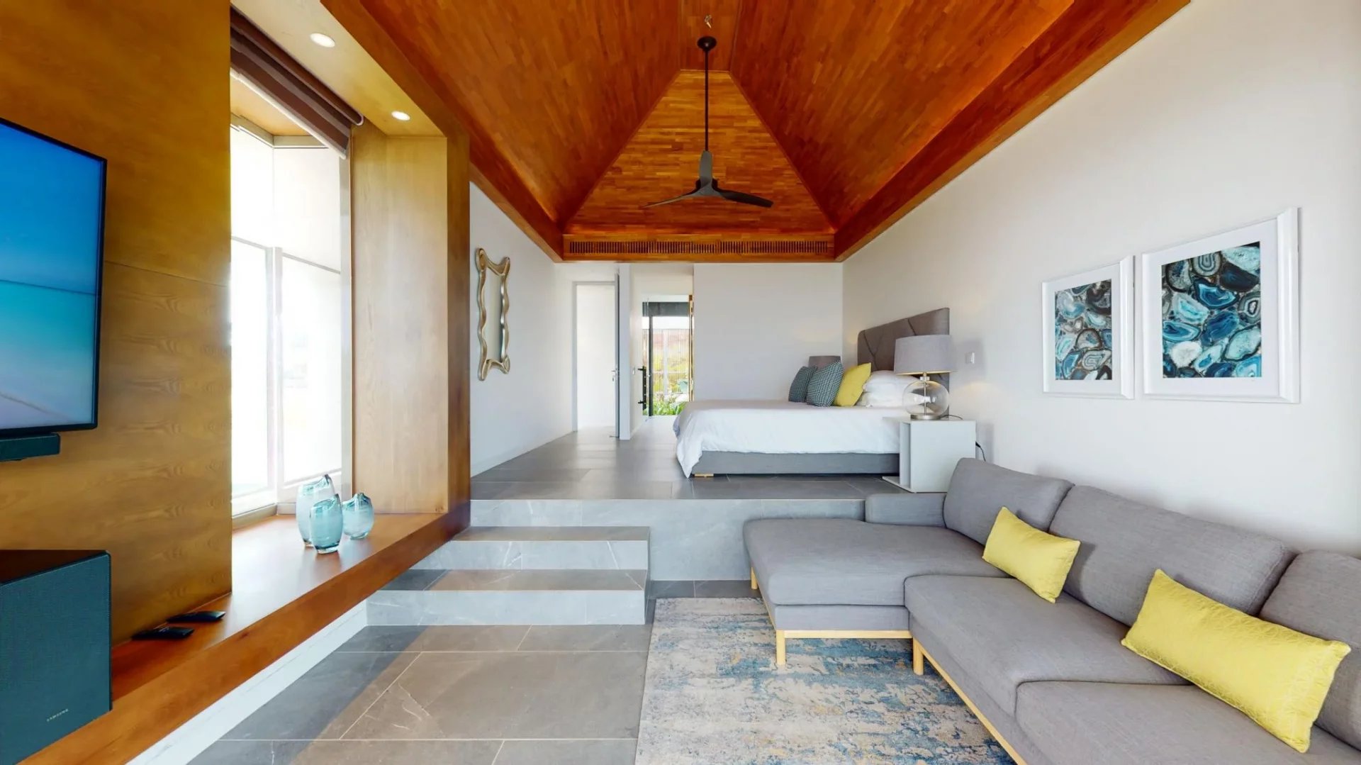La villa se compose de 5 chambres spacieuses, toutes en suite, offrant intimité et confort à ses résidents. Le rez-de-chaussée se caractérise par un vaste espace de vie lumineux avec de grandes baies vitrées et une hauteur sous plafond impressionnante. Il comprend une chambre pour invités, une cuisine américaine entièrement équipée, un salon-salle à manger et un coin bar, parfait pour recevoir.