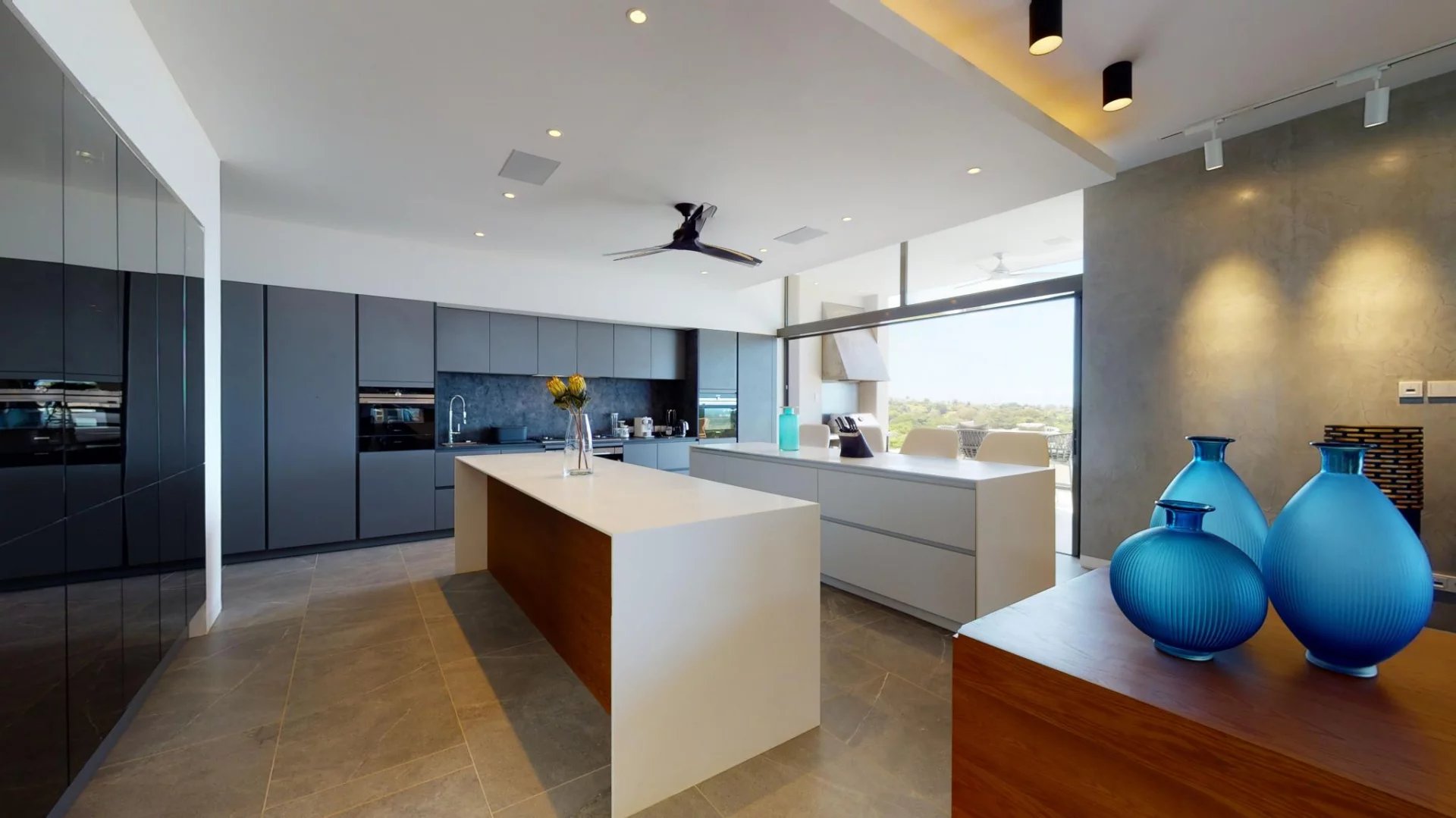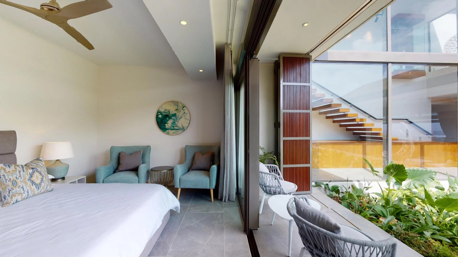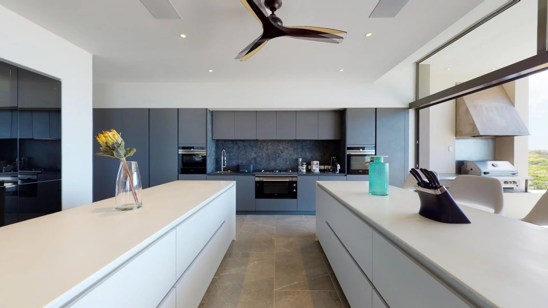 L'espace de vie s'ouvre sur une magnifique terrasse avec une piscine à débordement, offrant une vue spectaculaire sur l'océan. De l'autre côté, un charmant patio paysager avec une végétation tropicale complète cet espace détente. Le rez-de-chaussée comprend également 3 autres chambres en suite, un bureau, une salle de télévision, ainsi que la suite parentale. Cette dernière bénéficie d'une terrasse privée avec une vue sublime sur la mer, d’un dressing et d’une salle de bain en suite avec douche intérieure et extérieure.