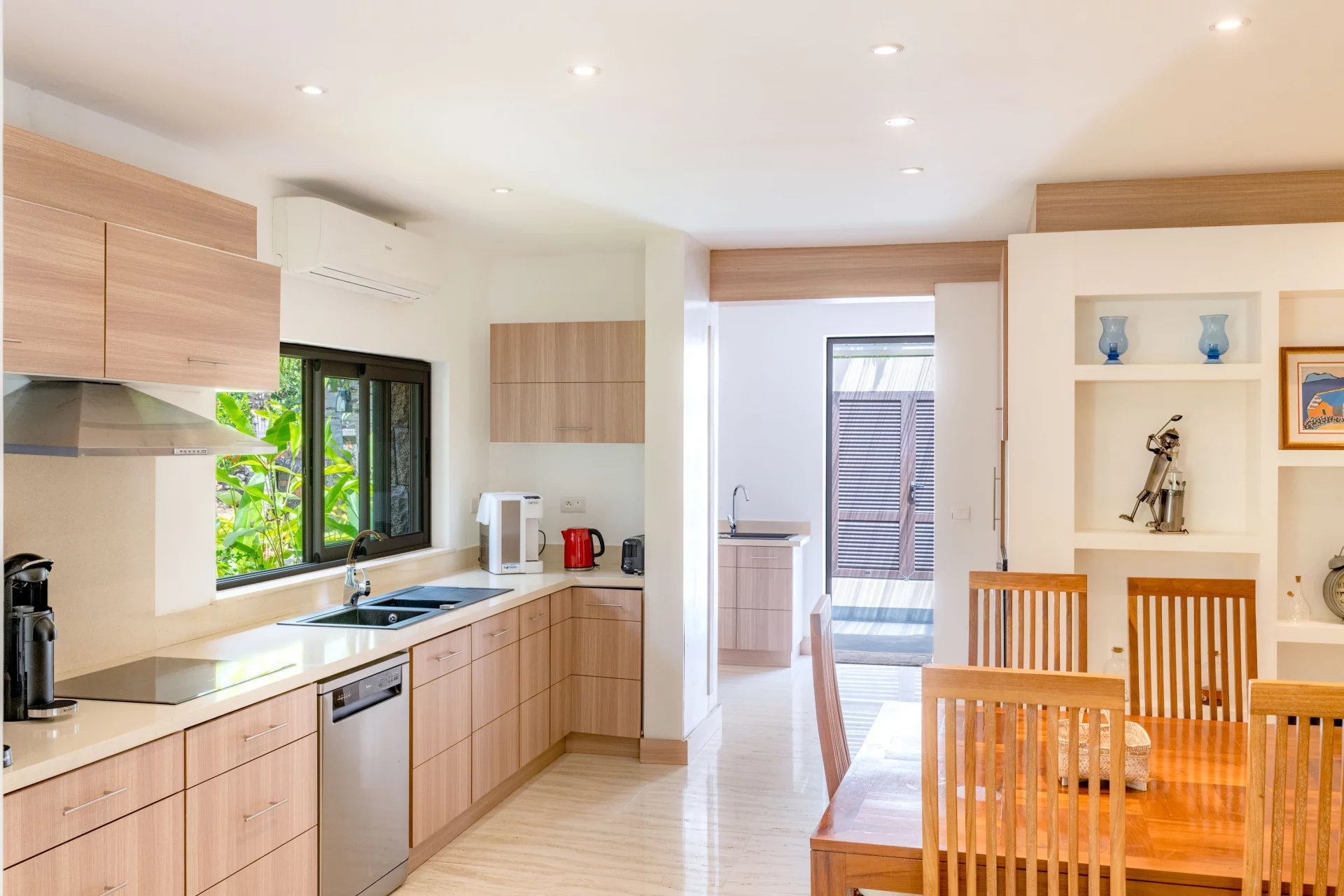 La cuisine spacieuse et entièrement équipée est accompagnée d’une arrière-cuisine et d’une buanderie. À l’extérieur, une immense piscine au sel de 15 x 7,5 mètres, entourée d’une terrasse de 200 m², surplombe le fairway. Ce cadre idyllique est parfait pour des moments de détente et de sérénité. Plusieurs espaces de repos, dont un kiosque et un bar en bois et pierres, invitent à des dîners en plein air et à la relaxation.