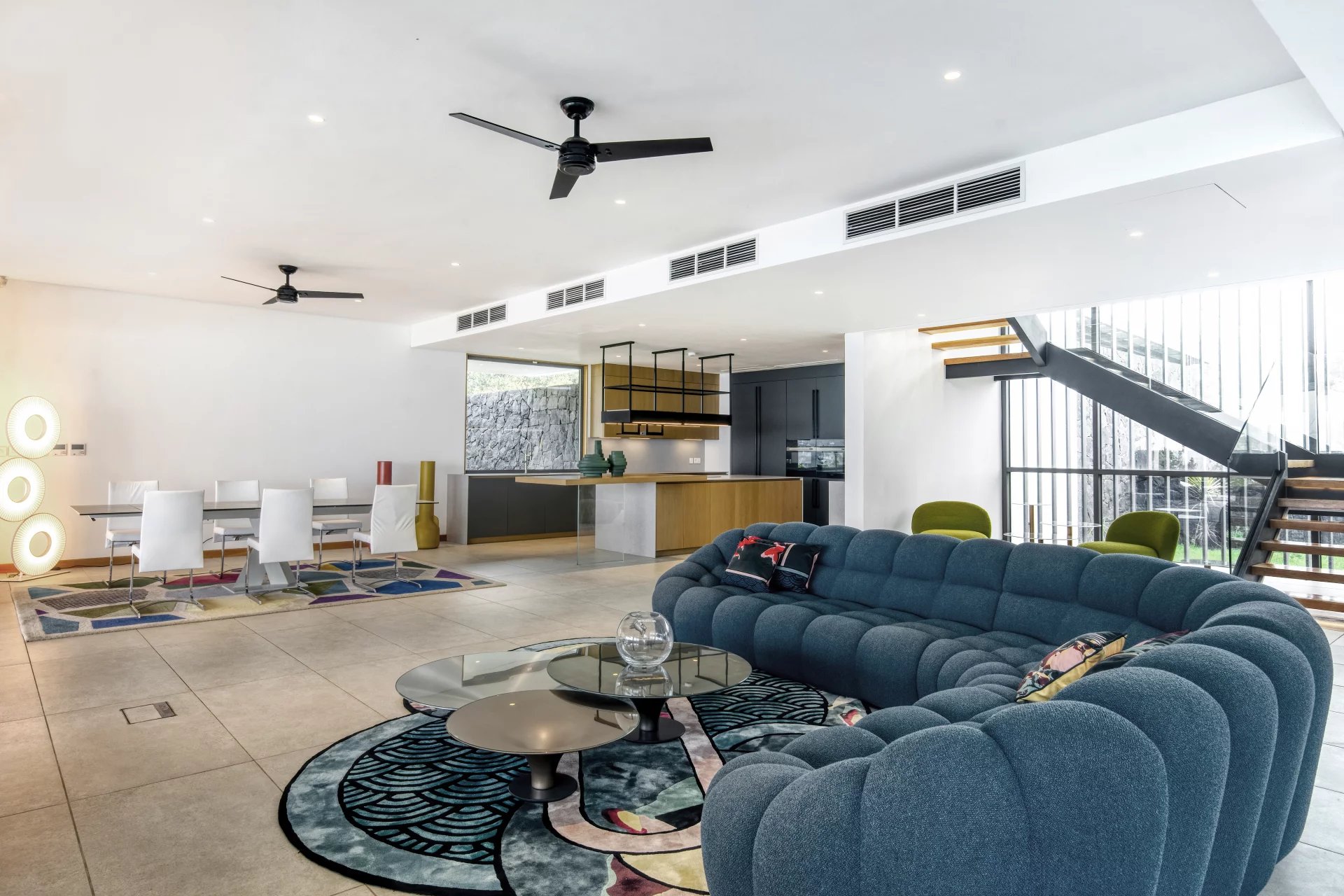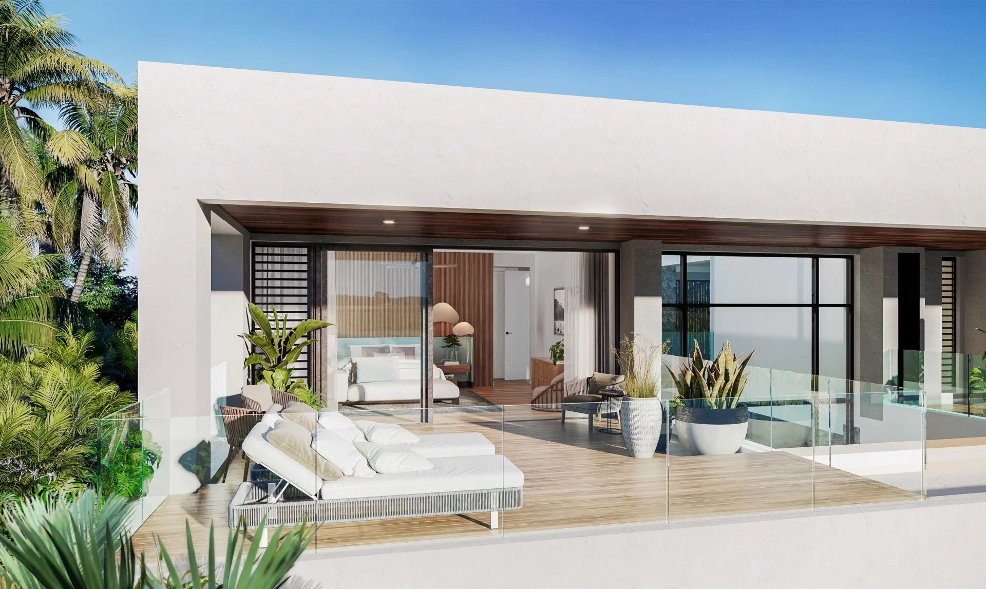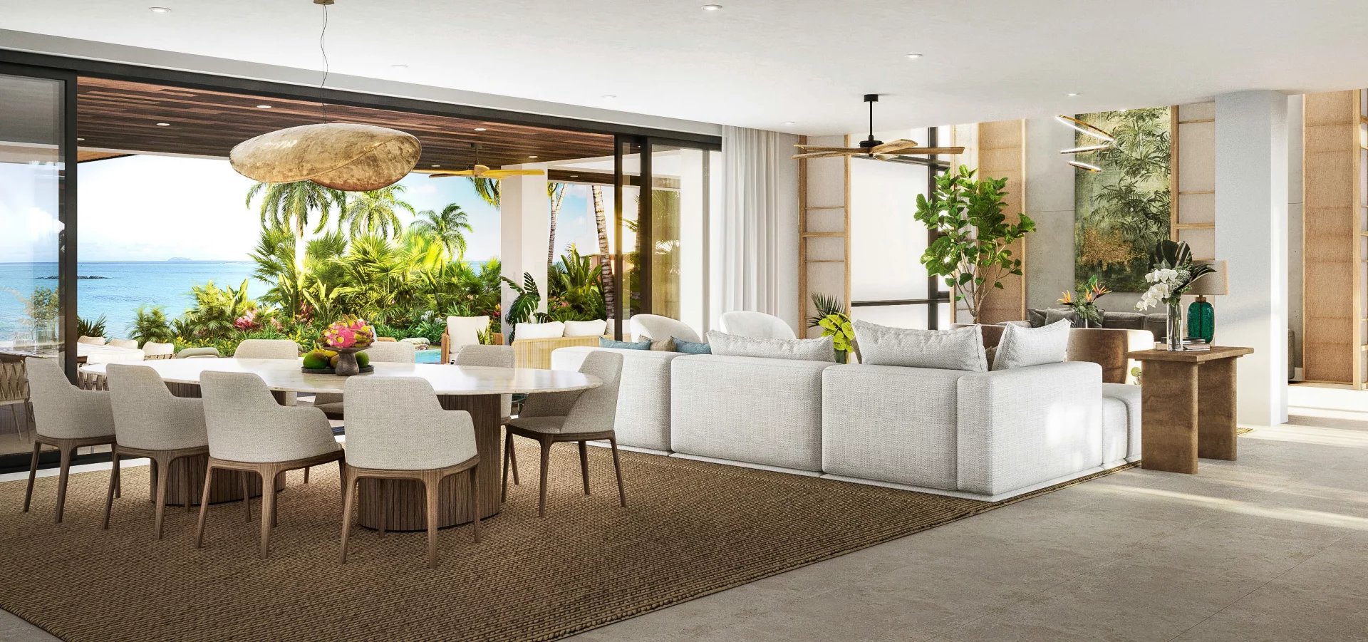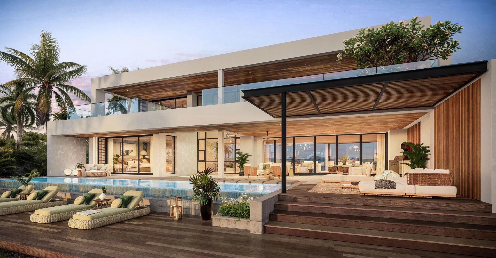 La luminosité naturelle qui envahit les intérieurs et un plan ouvert qui accueille des possibilités à l’infini procurent des espaces propices aux moments d’intimité tout comme aux espacés de convivialité. Votre villa se pare de nuances, au gré des ombres changeantes des arbres et des reflets bleutés de l’océan. Au fil du jour et de la nuit, les parois vitrées