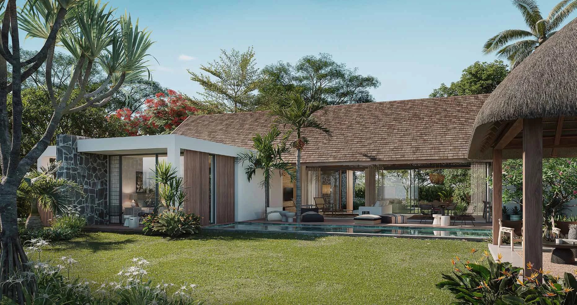 Cette magnifique villa jouit d'une double exposition nord-sud en bordure de la prestigieuse allée de palmiers (Palm Alley). Tout au long de la journée, la lumière naturelle inonde les espaces de vie, créant une ambiance chaleureuse et accueillante. Inspirée du concept de "vie en varangue" typique de l'architecture mauricienne, elle offre un grand espace central qui sert à la fois de salon, de salle à manger et de cuisine, offrant un accès direct sur l'extérieur et la belle piscine. La toiture à deux pans, caractéristique de l'île, assure une circulation d'air optimale et renforce cette impression d'espace. Les matériaux organiques utilisés, tels que les murs en pierres grises avec joints à cordons blancs d'antan, les toitures et les auvents de protection du soleil et de la pluie, créent une ambiance rustique et authentique. Les chambres, équipées de larges baies vitrées offrent des espaces confortables et aérés pour des nuits paisibles. Cette villa propose également une pièce pouvant servir de bureau ou de salle télé ou éventuellement être convertie en quatrième chambre en-suite (en option). Le gazebo en chaume (en option) permet de profiter d’un espace de détente supplémentaire au cœur de la nature.