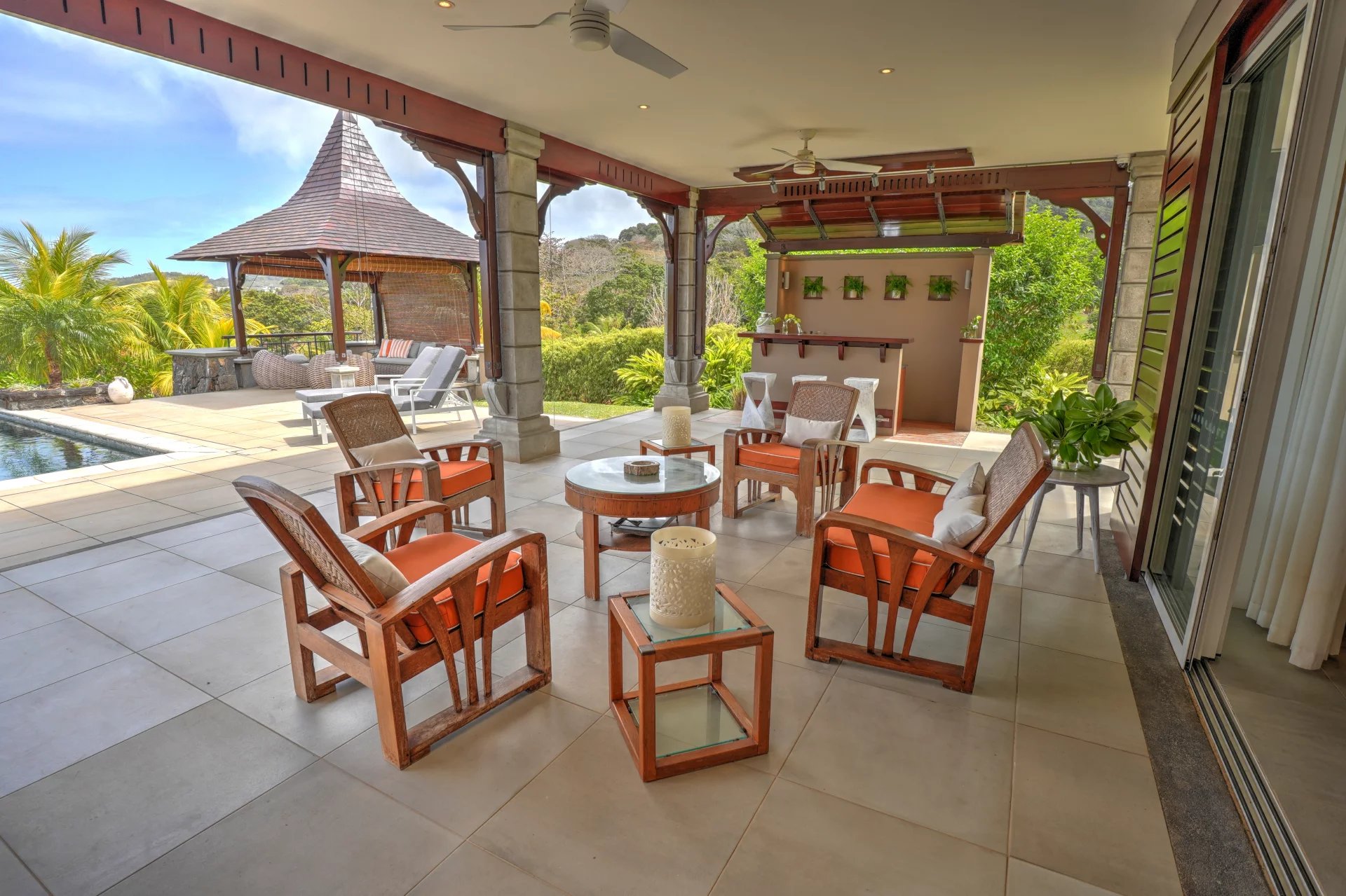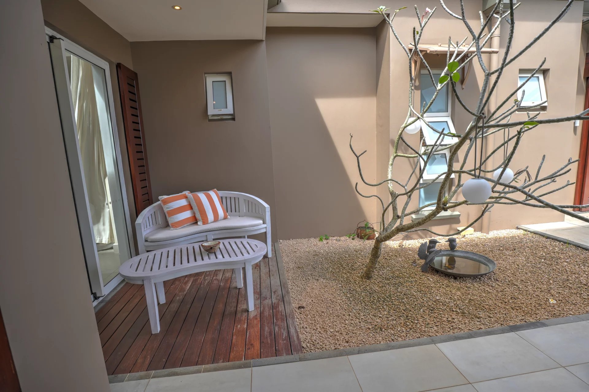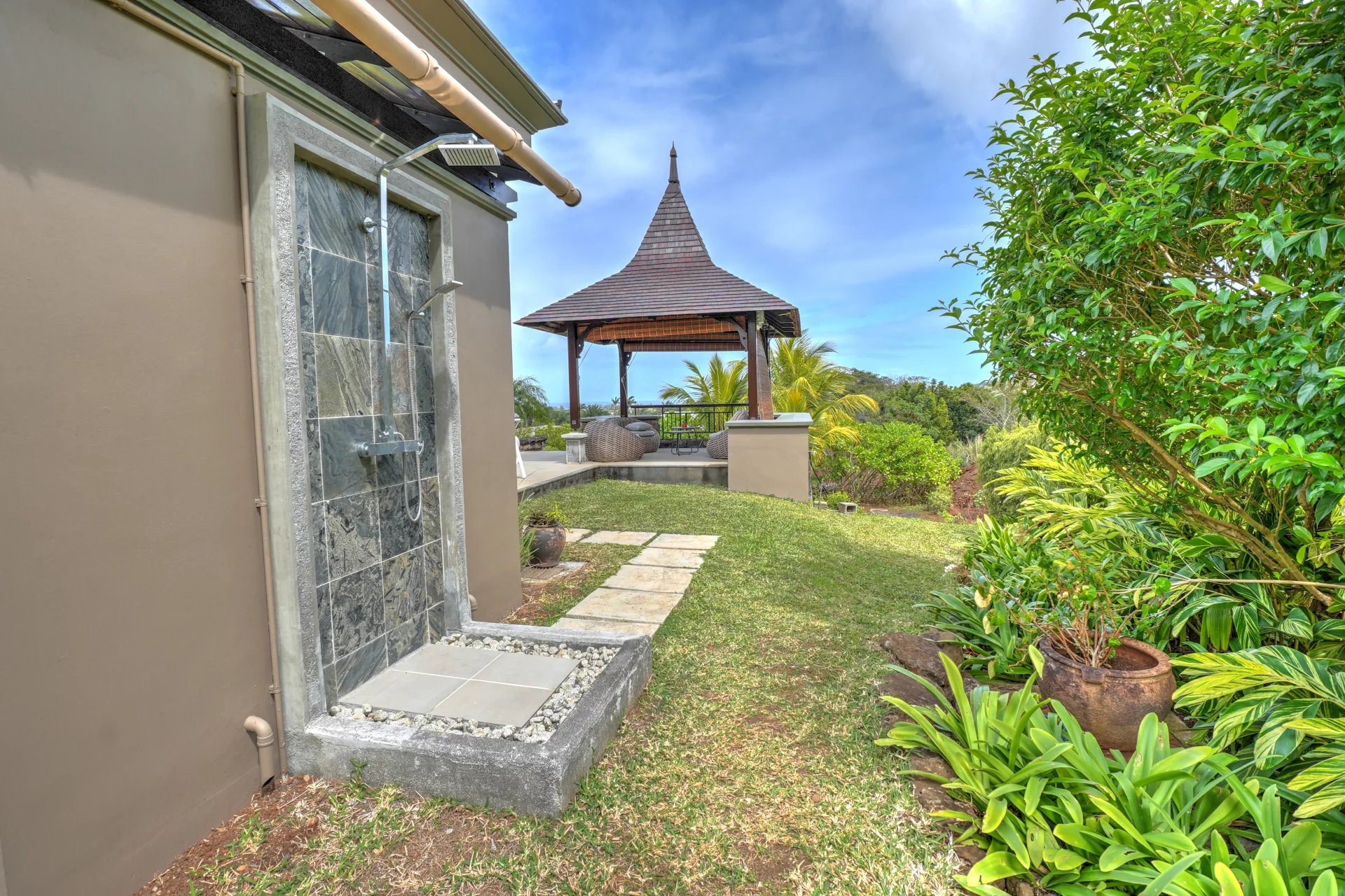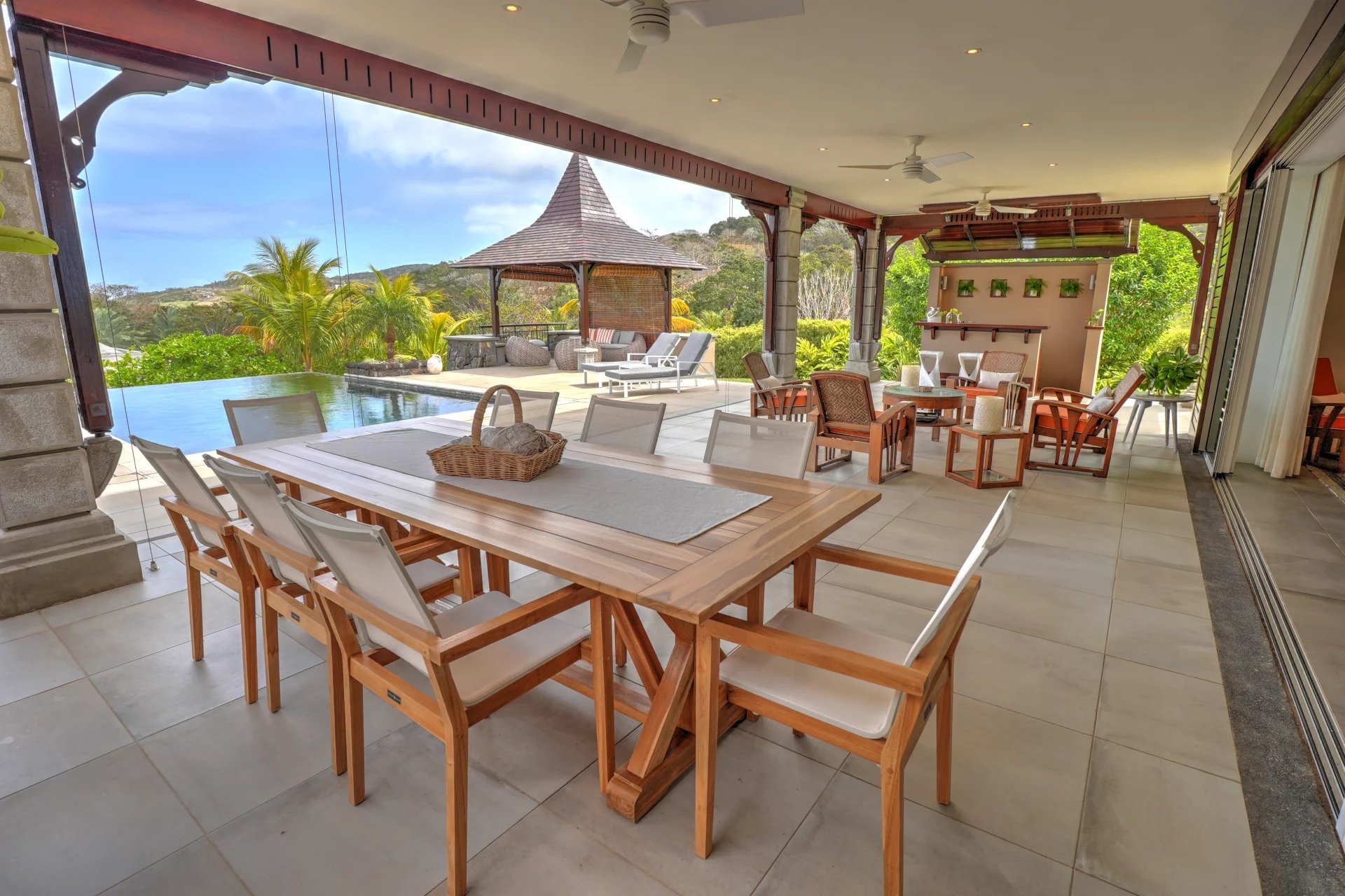 Les quatre chambres en suite sont de véritables sanctuaires de confort, avec une chambre principale qui s'ouvre sur une douche extérieure et une baignoire, pour un moment de détente en pleine nature. Chaque chambre est équipée d'un système de climatisation centralisé, assurant un confort optimal en toute saison.